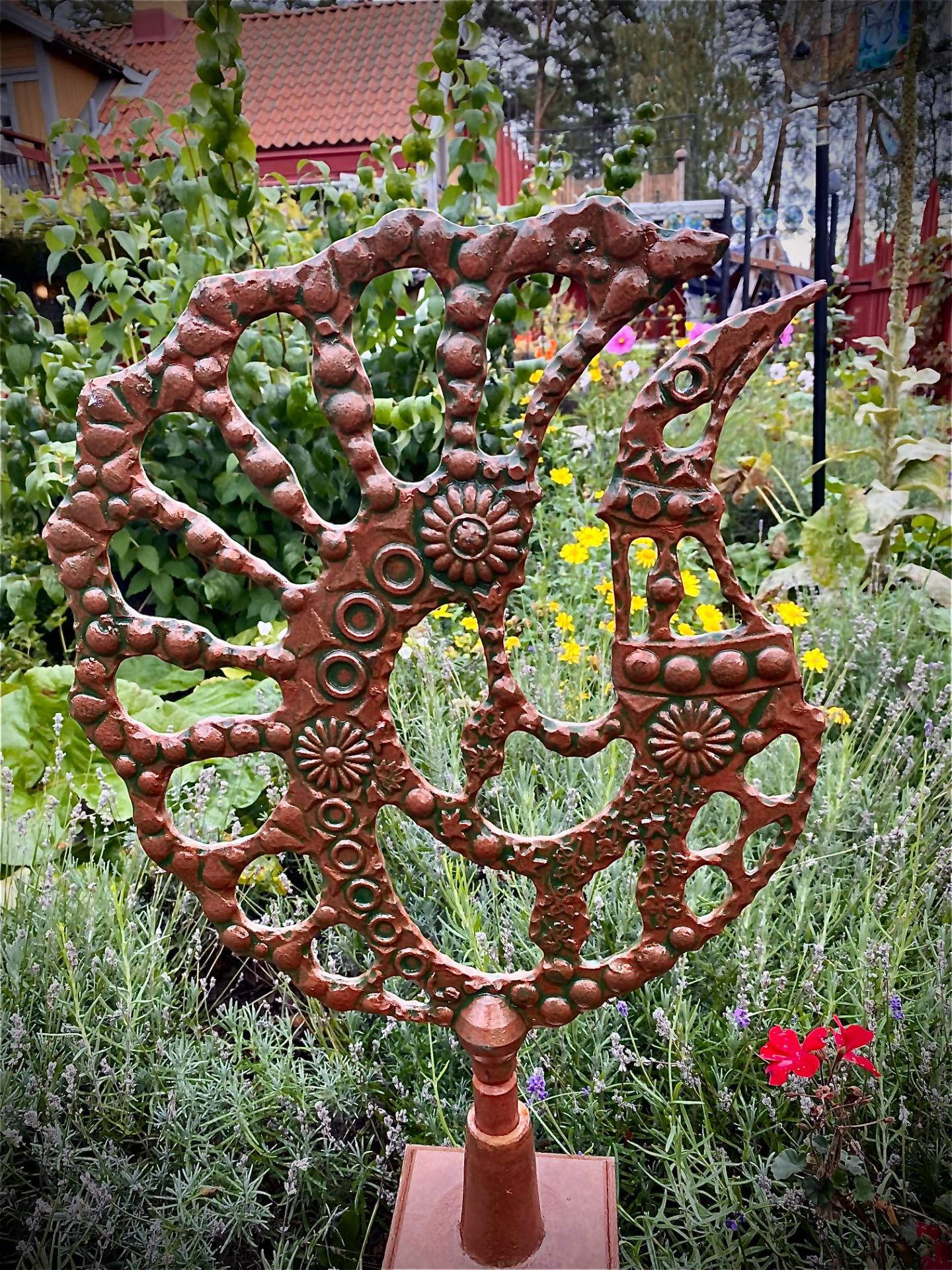 I vår trädgård samspelar skulpturerna med ljus, vind och årstidernas skiftningar. Här blir daggens glitter, dimmans mjukhet och kvällssolens värme en del av verken.